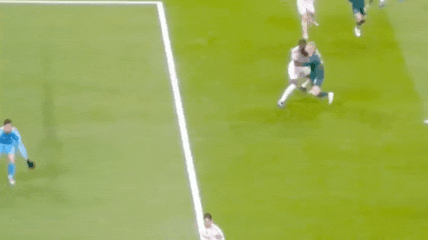 下半场回来,双方继续快节奏的攻防转换,贝林厄姆的挑射、谢尔基劲射,均差之毫厘。阿隆索将居莱尔换上,进一步改善前场的攻势。但是曼城利用两个边路的不断调动,谢尔基突破、传球,以及多库的闪转腾挪,令皇马的后防屡次出现慌乱。
